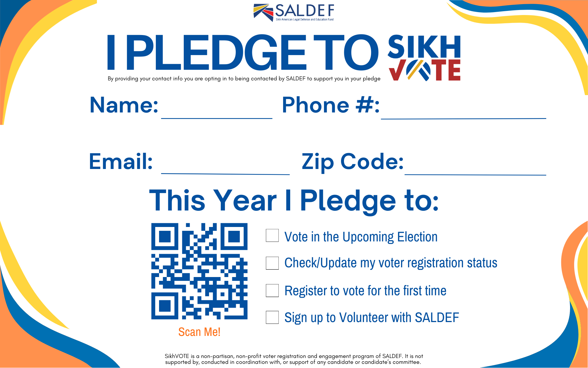 Make a Plan: Print out the #SikhVOTE Pledge Card and share a photo of you holding it. Tag SALDEF on social media for a chance to be featured!
